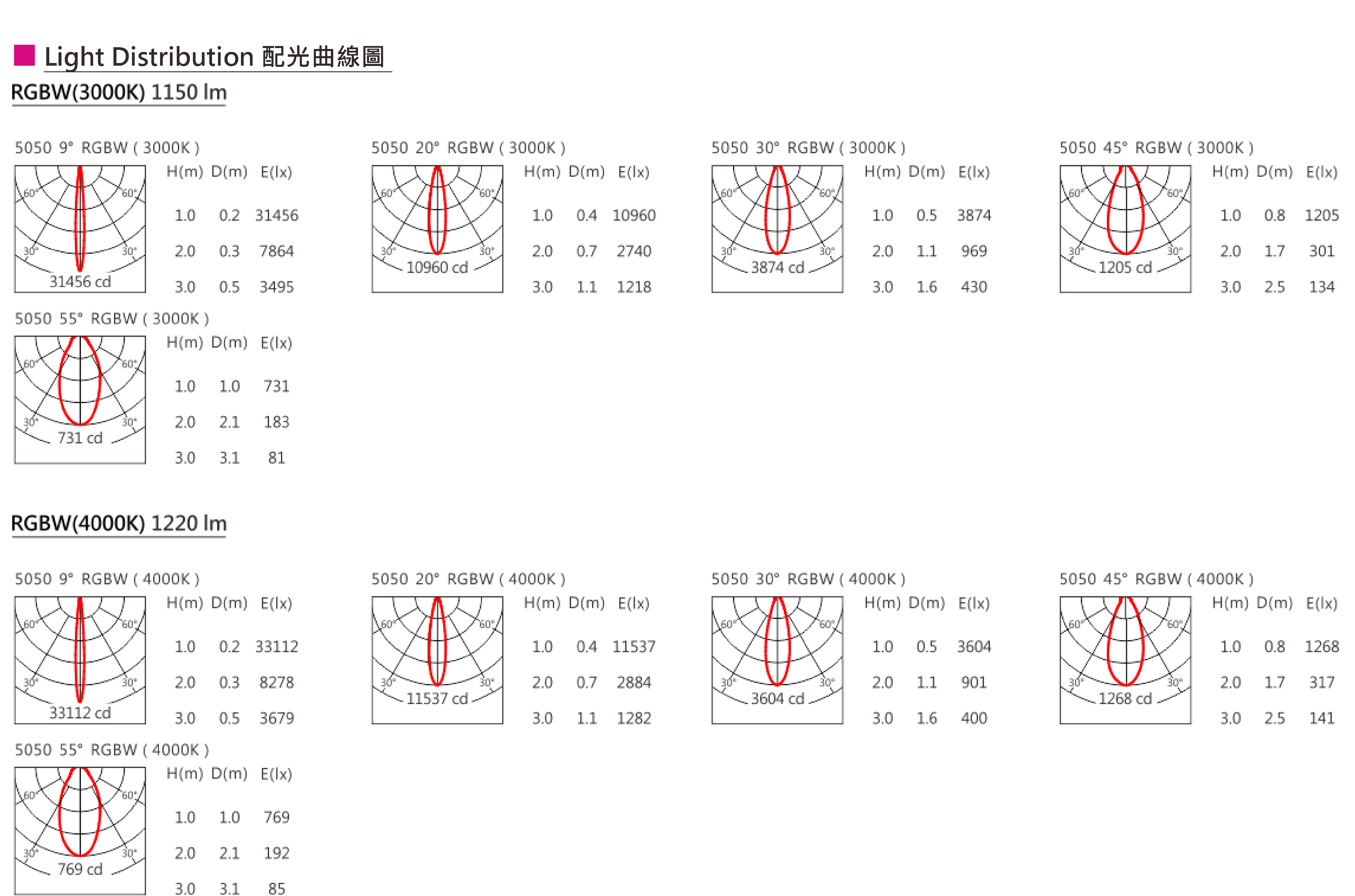 色溫(Color Temperature):2700K、3000K、3500K、4000K