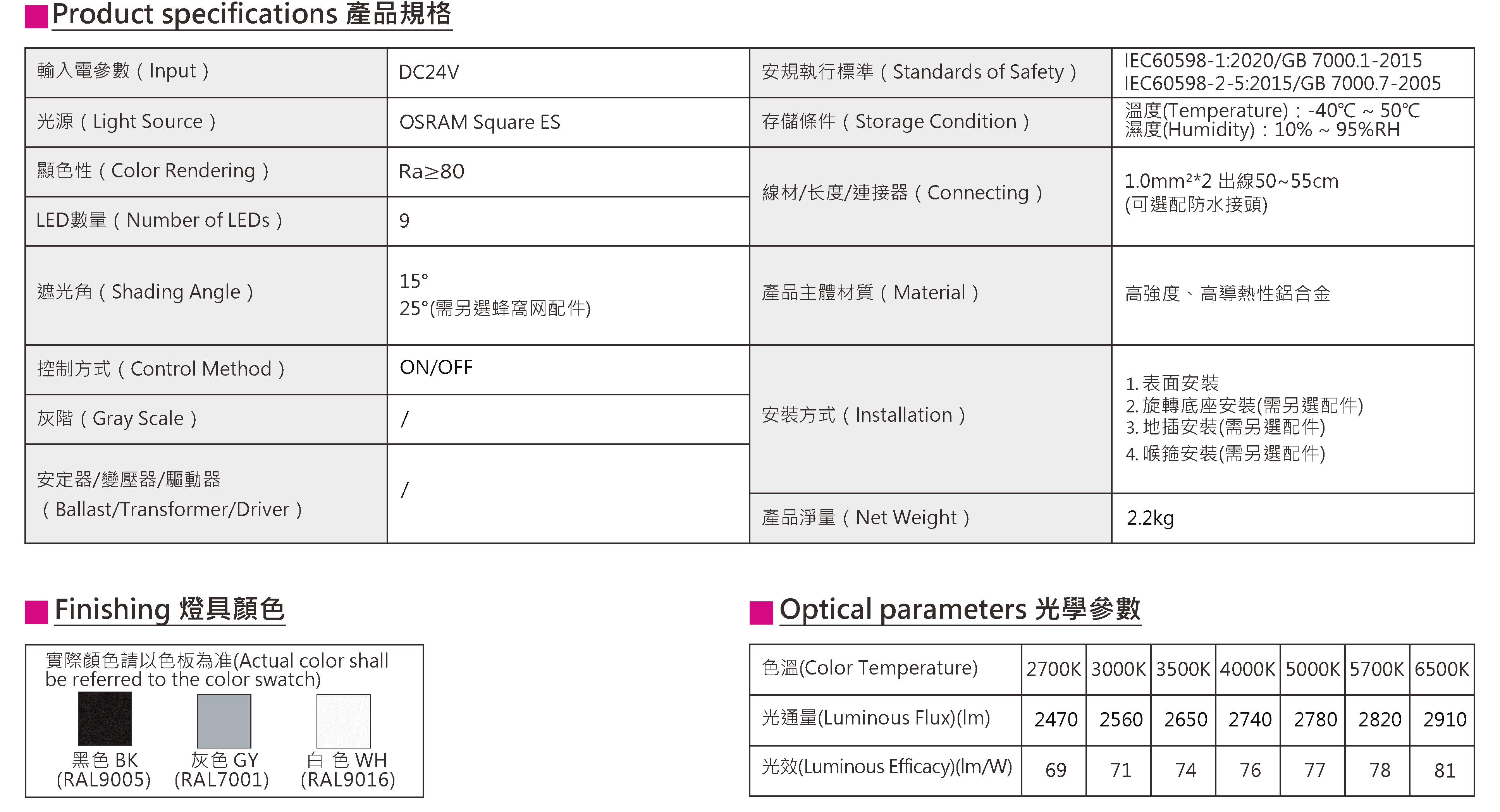 色溫(Color Temperature):2700K、3000K、3500K、4000K、5000K、5700K、6500K