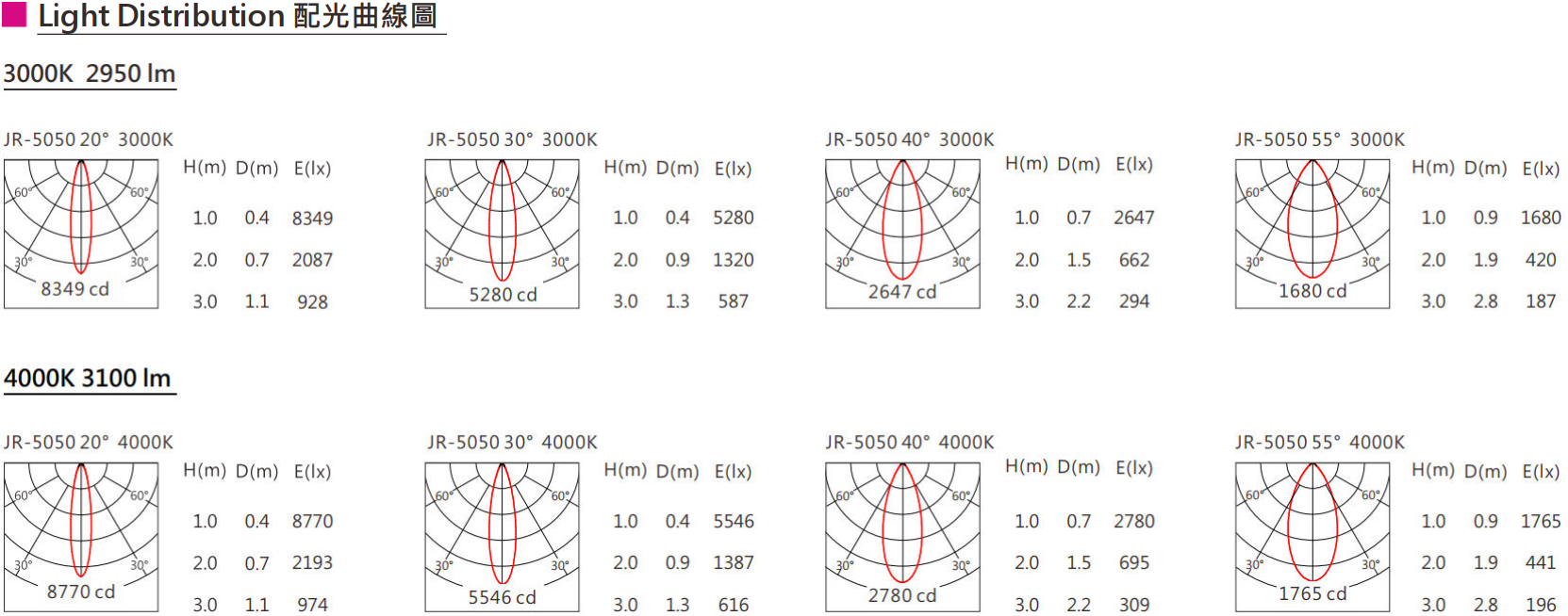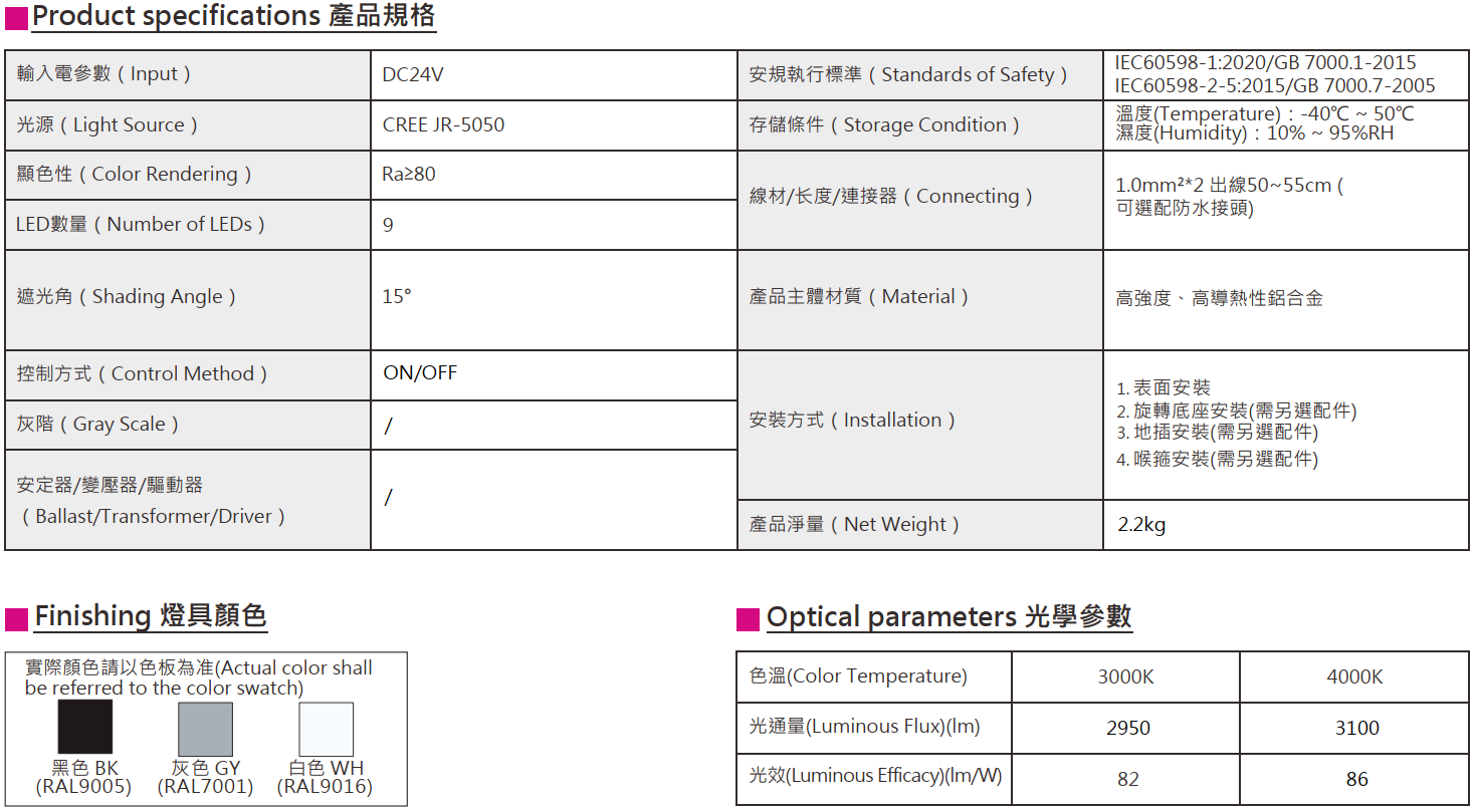 色溫(Color Temperature):3000K、4000K
