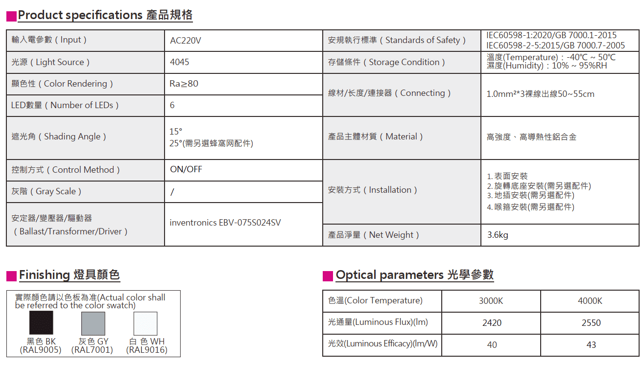 色溫(Color Temperature):3000K、4000K
