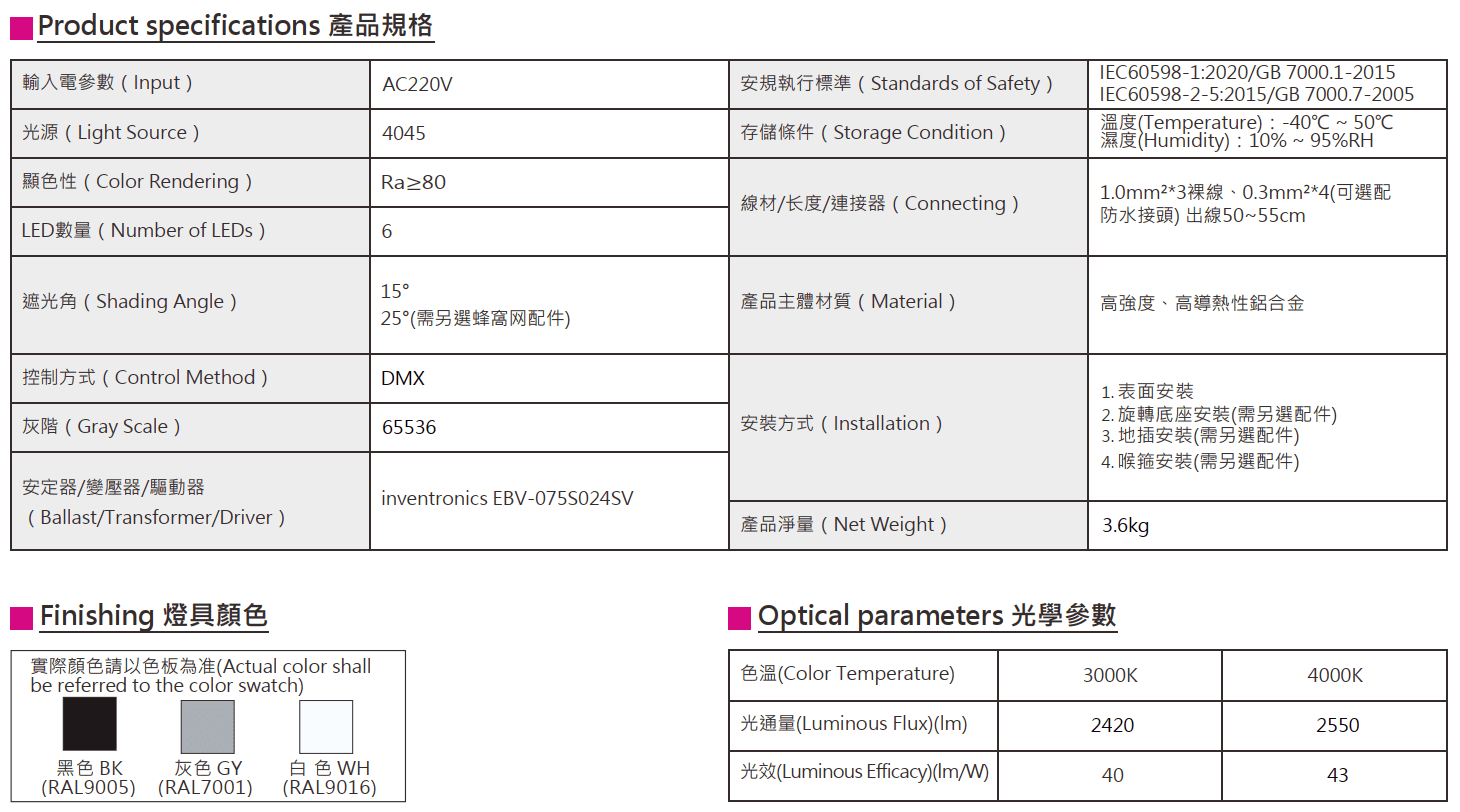 色溫(Color Temperature):3000K、4000K