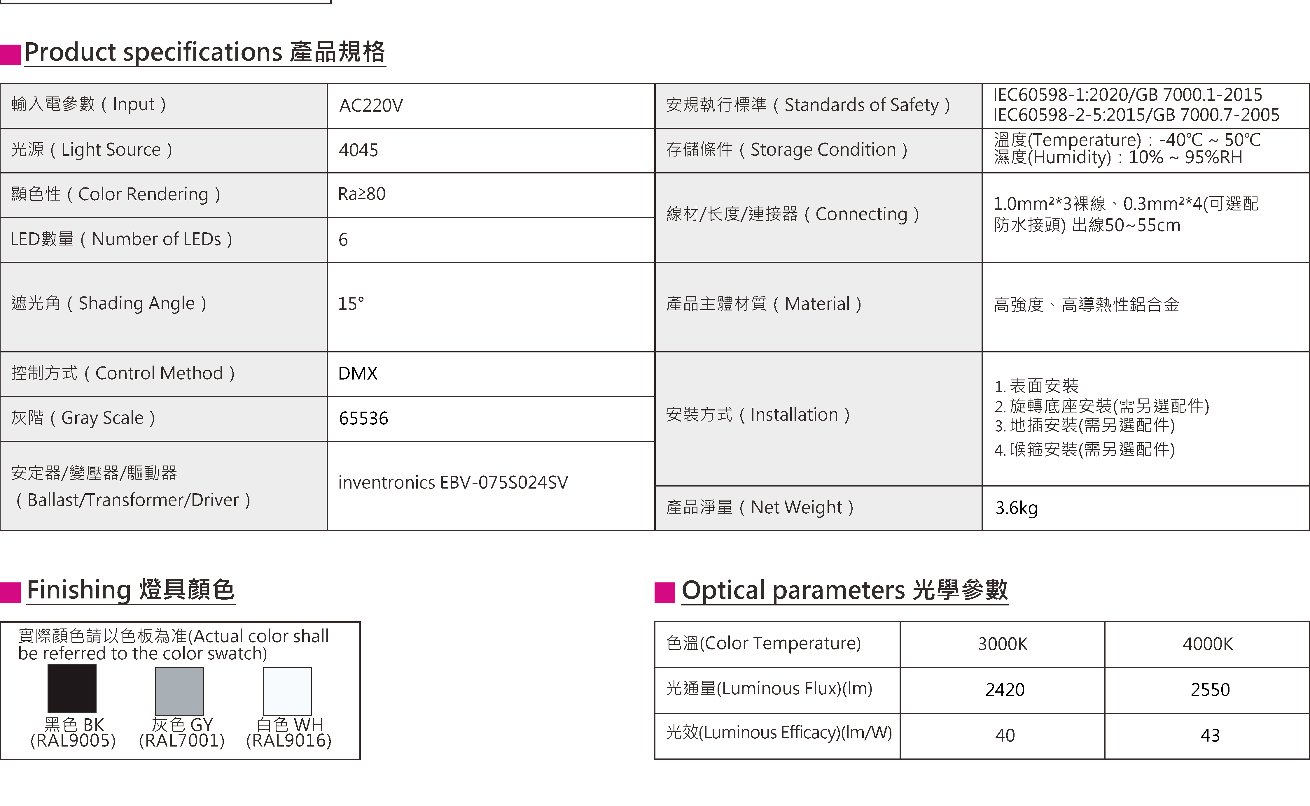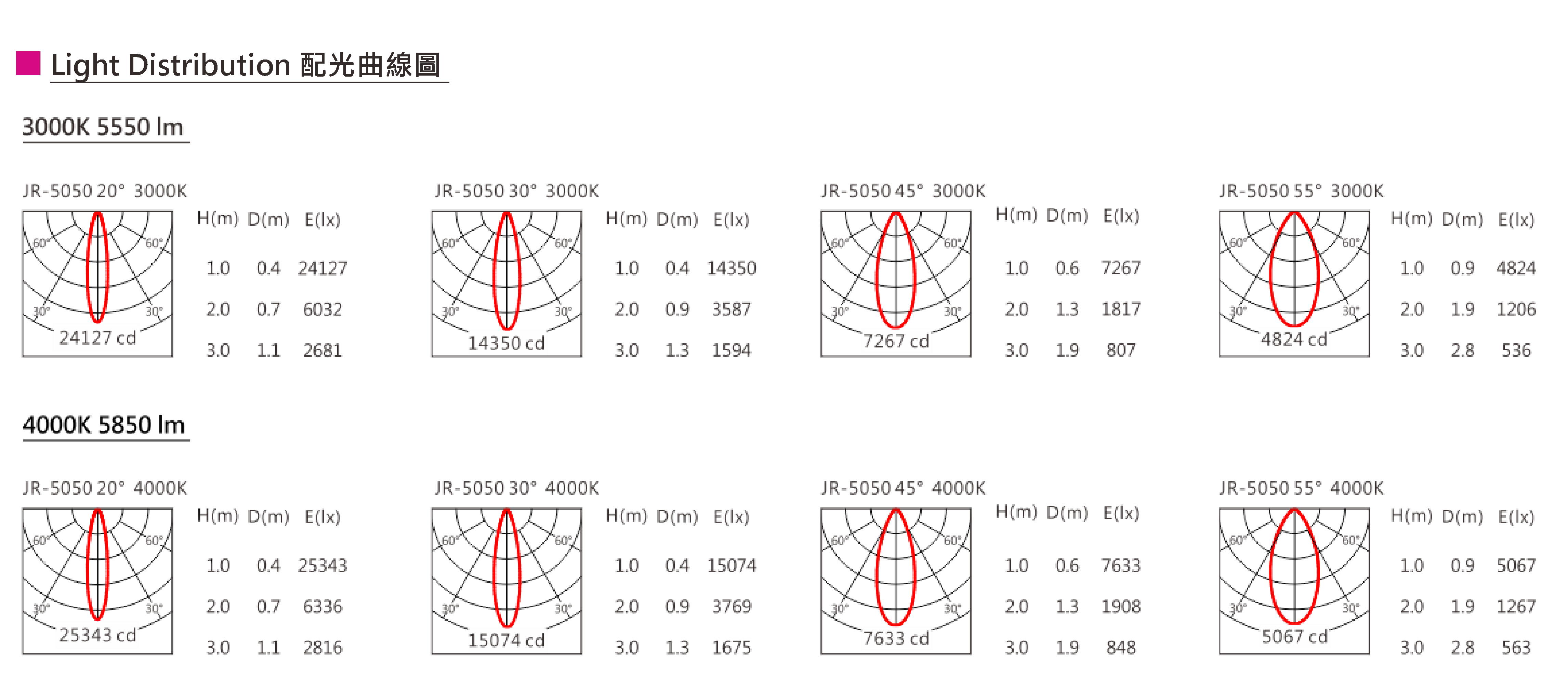 光形左右對稱,采⽤了三次配光設計,多種投射⾓度及光學配件可供選