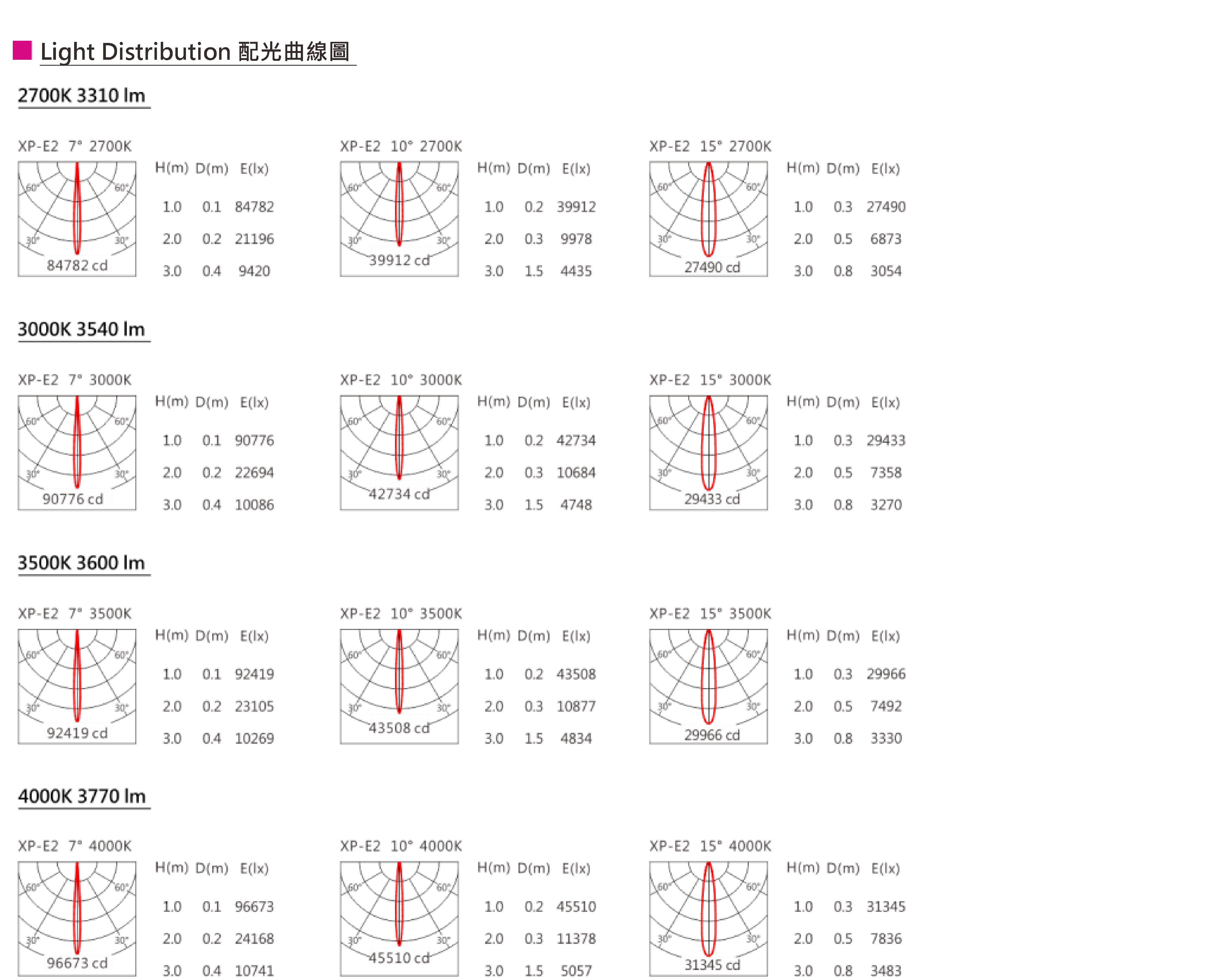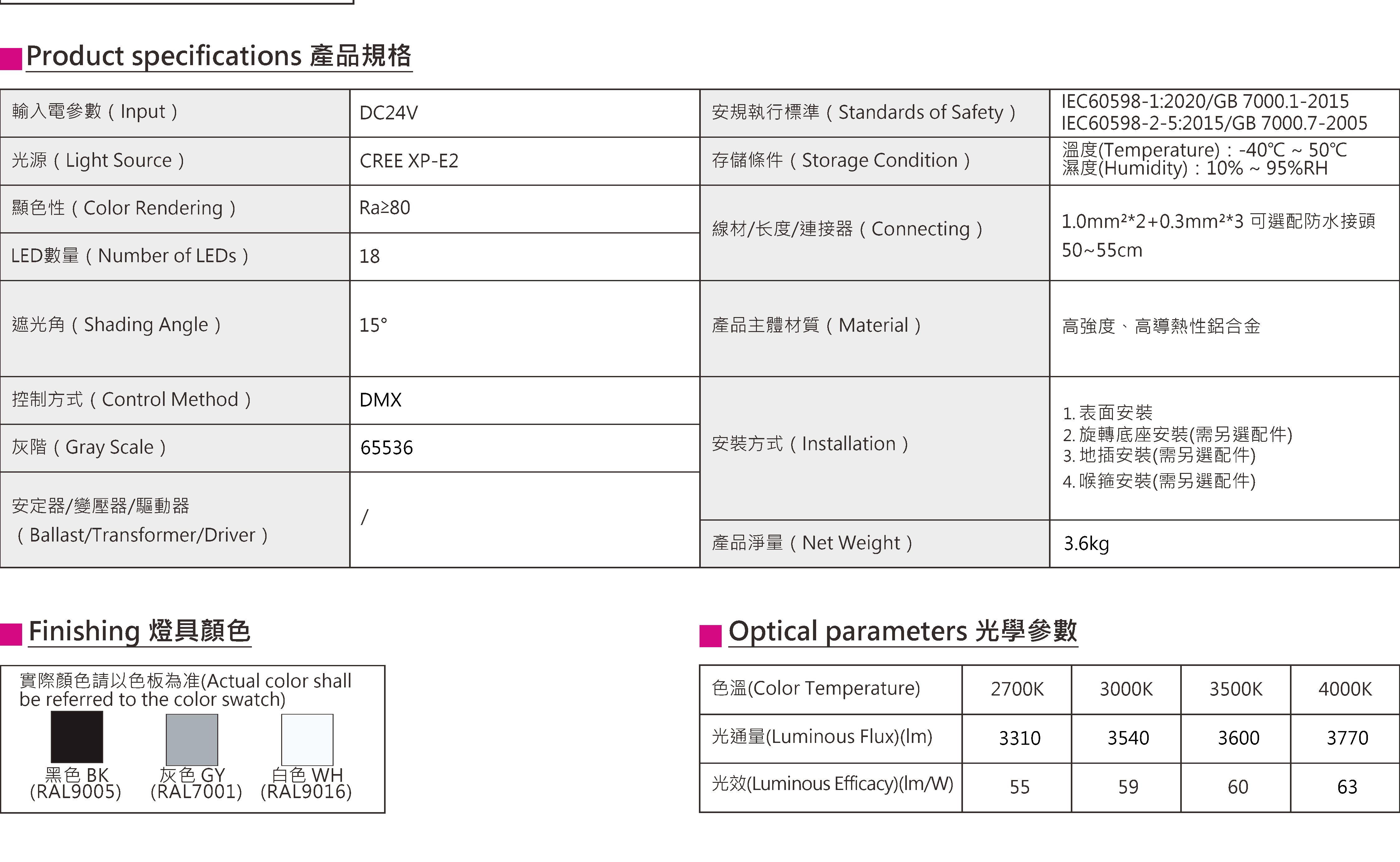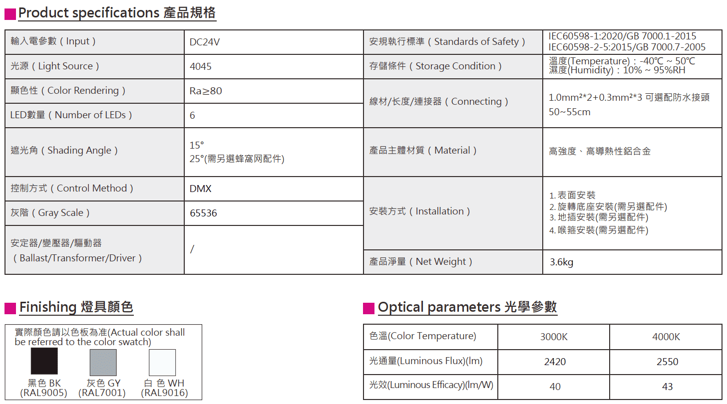 色溫(Color Temperature):3000K、4000K