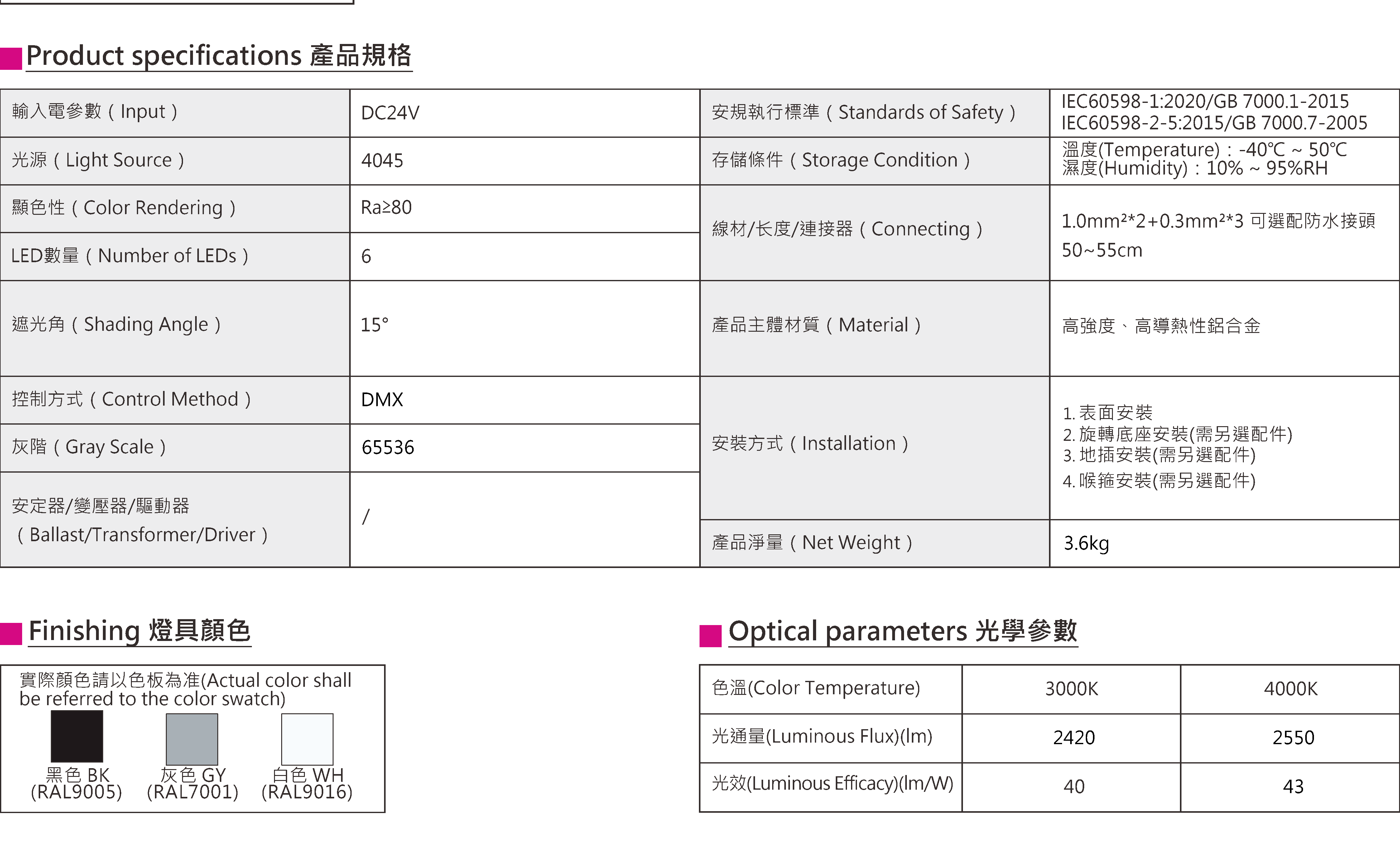 功率:55W 電壓: DC24V 控制方式:DMX 光色:W 燈數:6 光束角:3°
