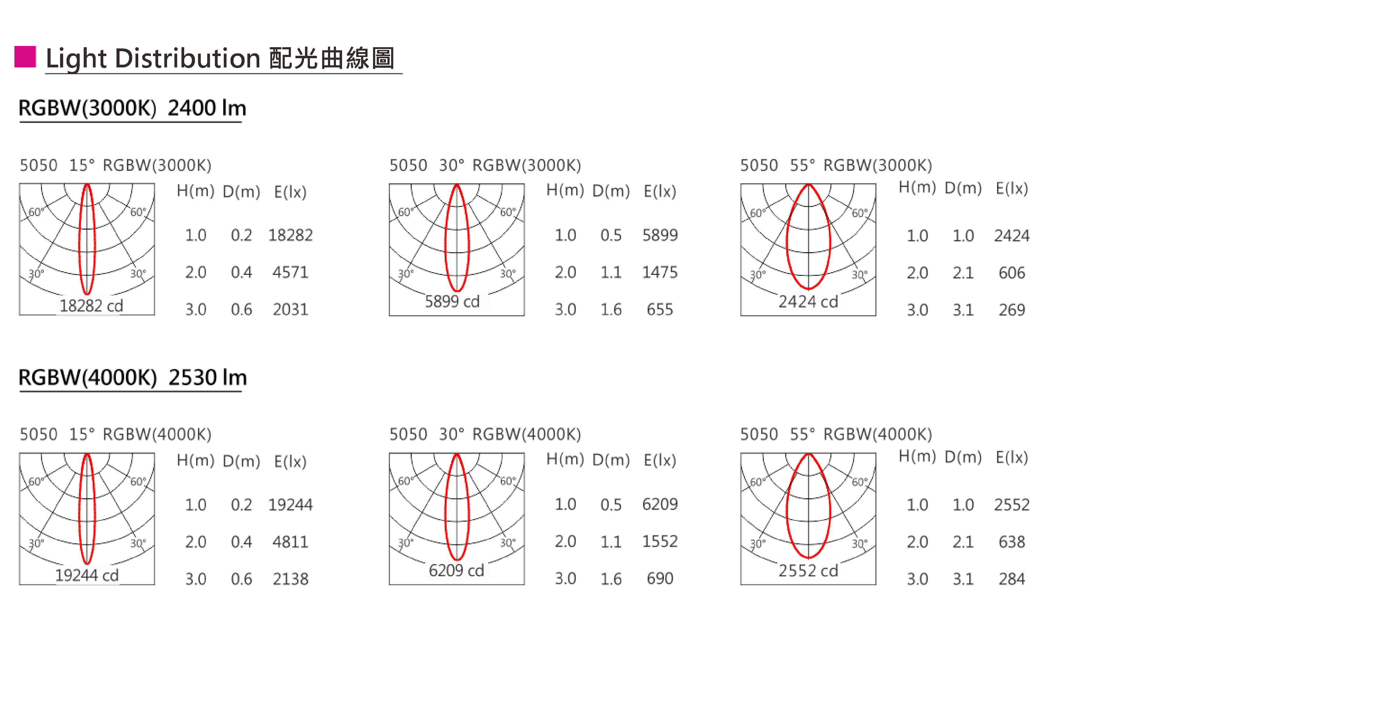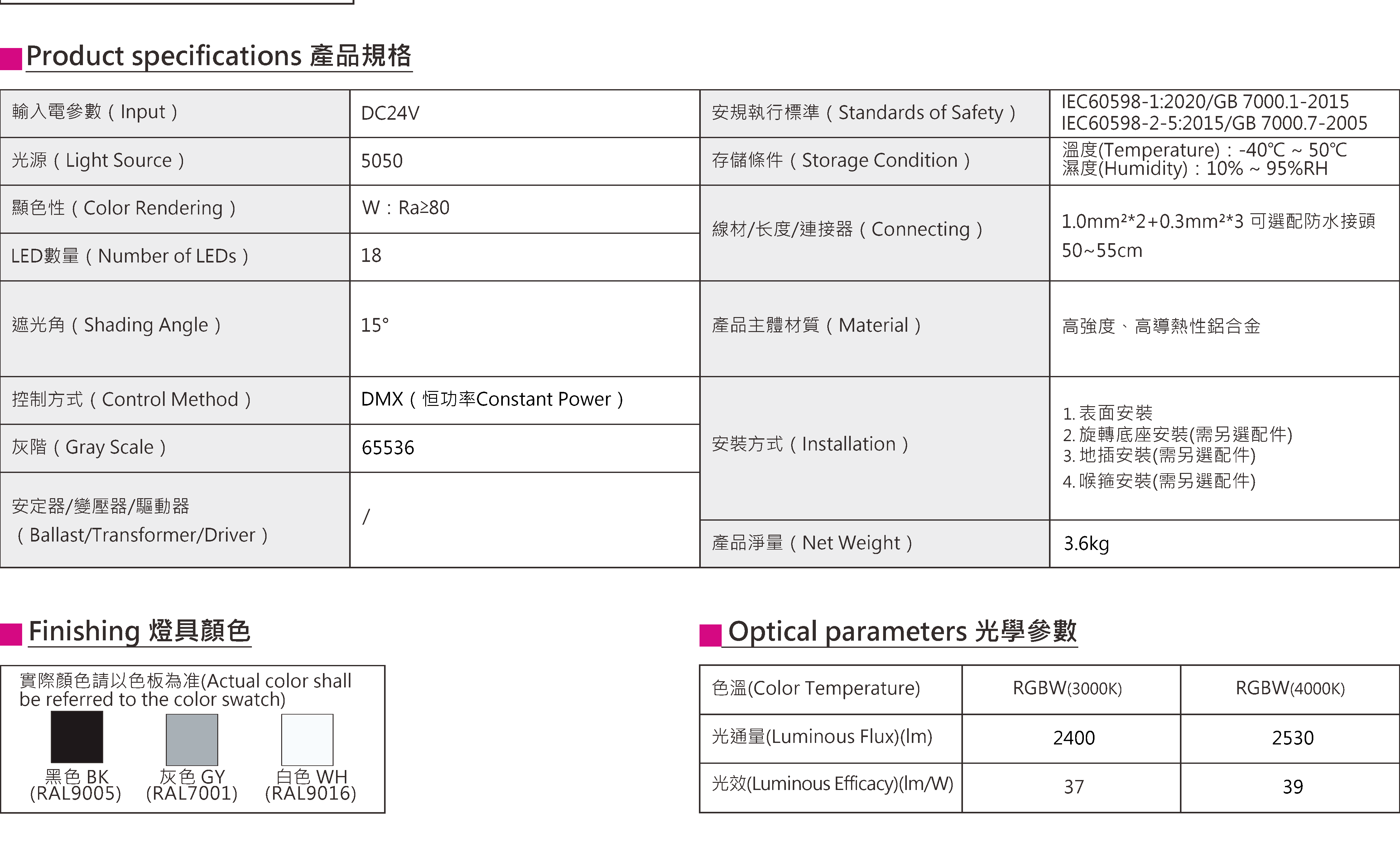色溫(Color Temperature):2700K、3000K、3500K、4000K