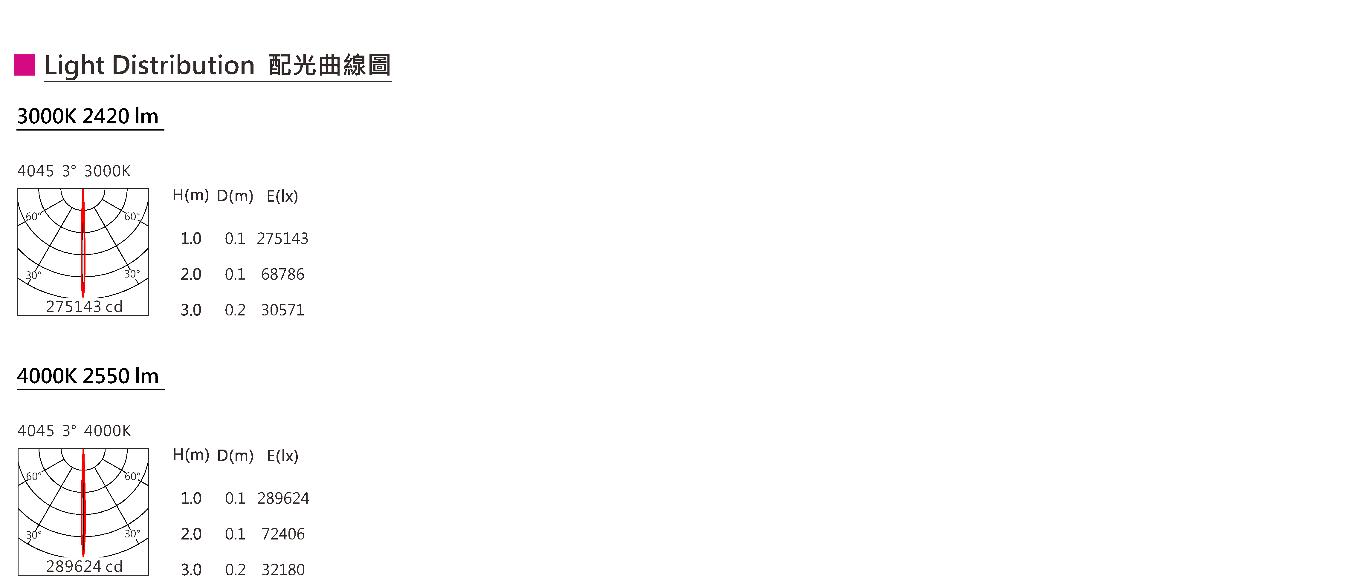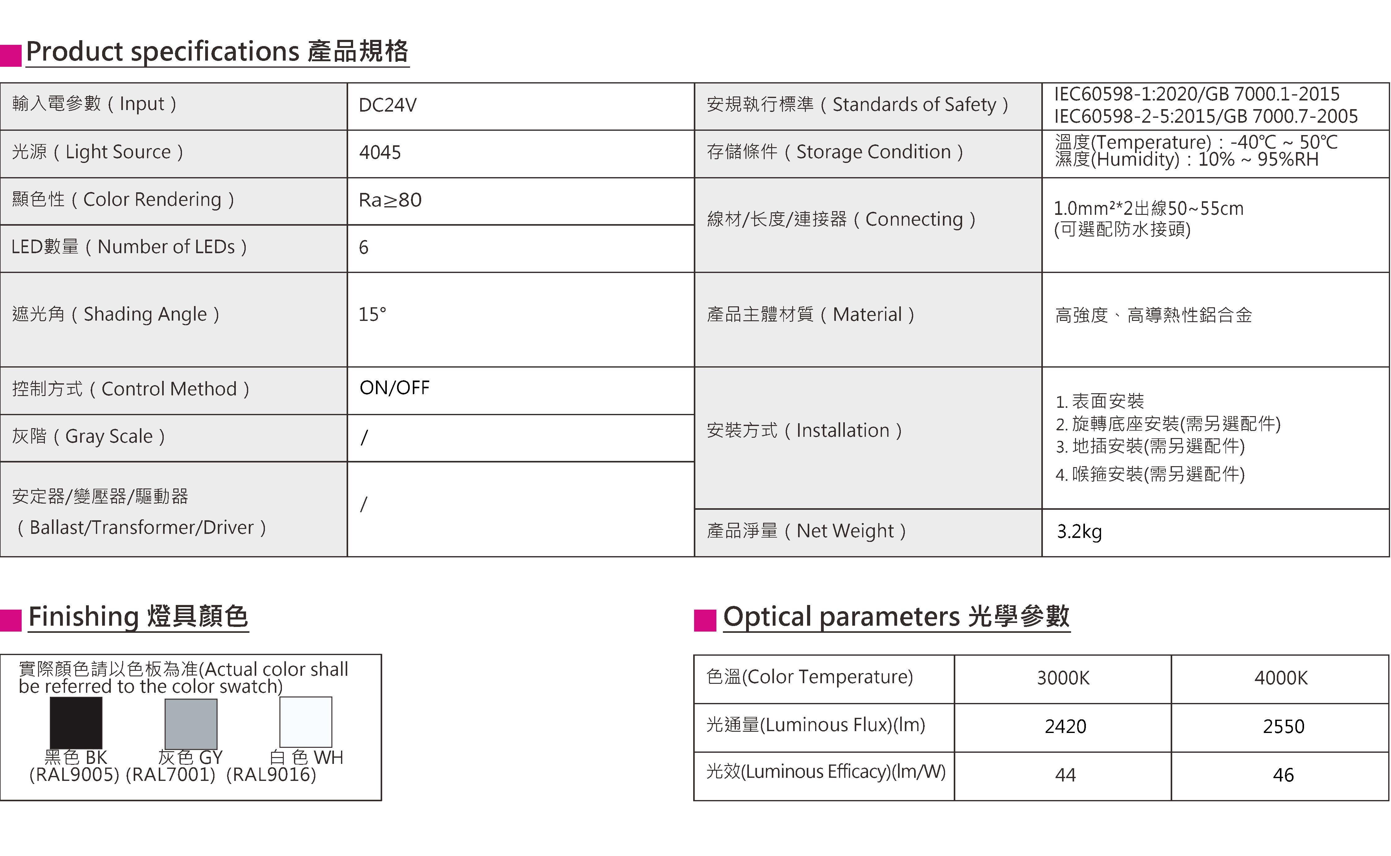 色溫(Color Temperature):2700K、3000K、3500K、4000K