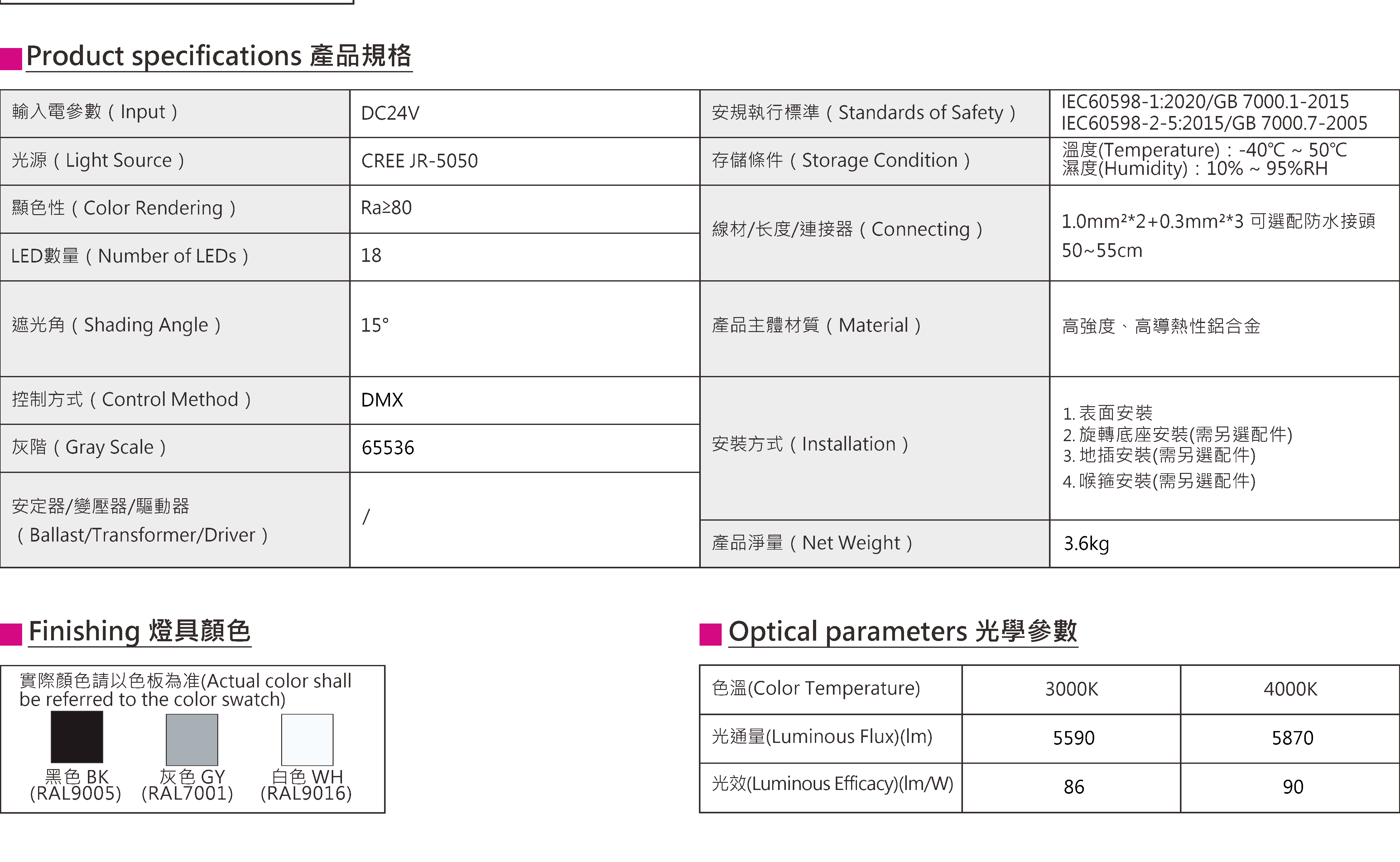色溫(Color Temperature):RGBW(W:3000K、4000K)