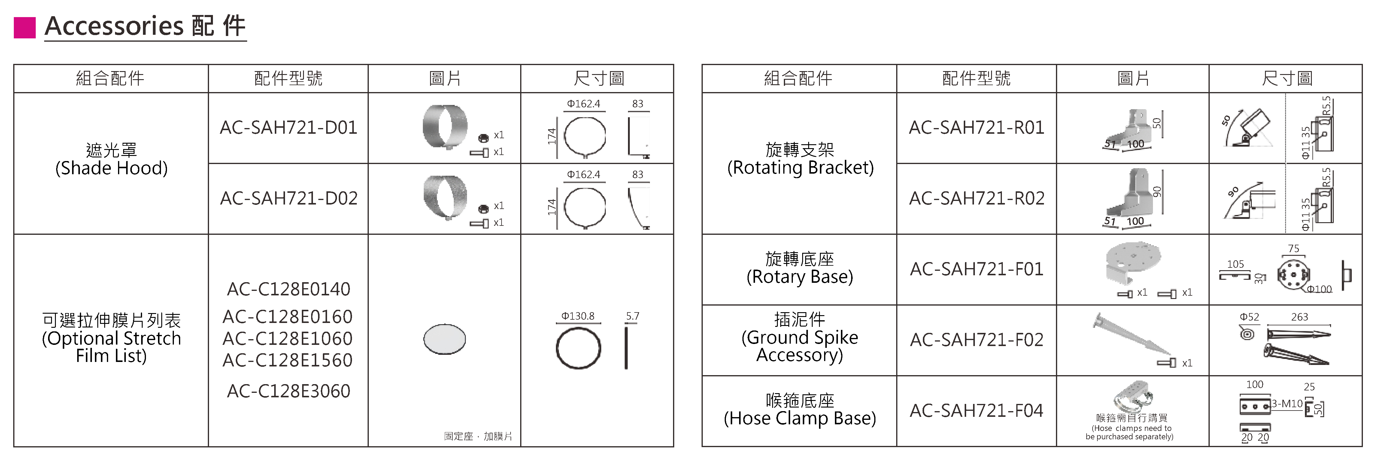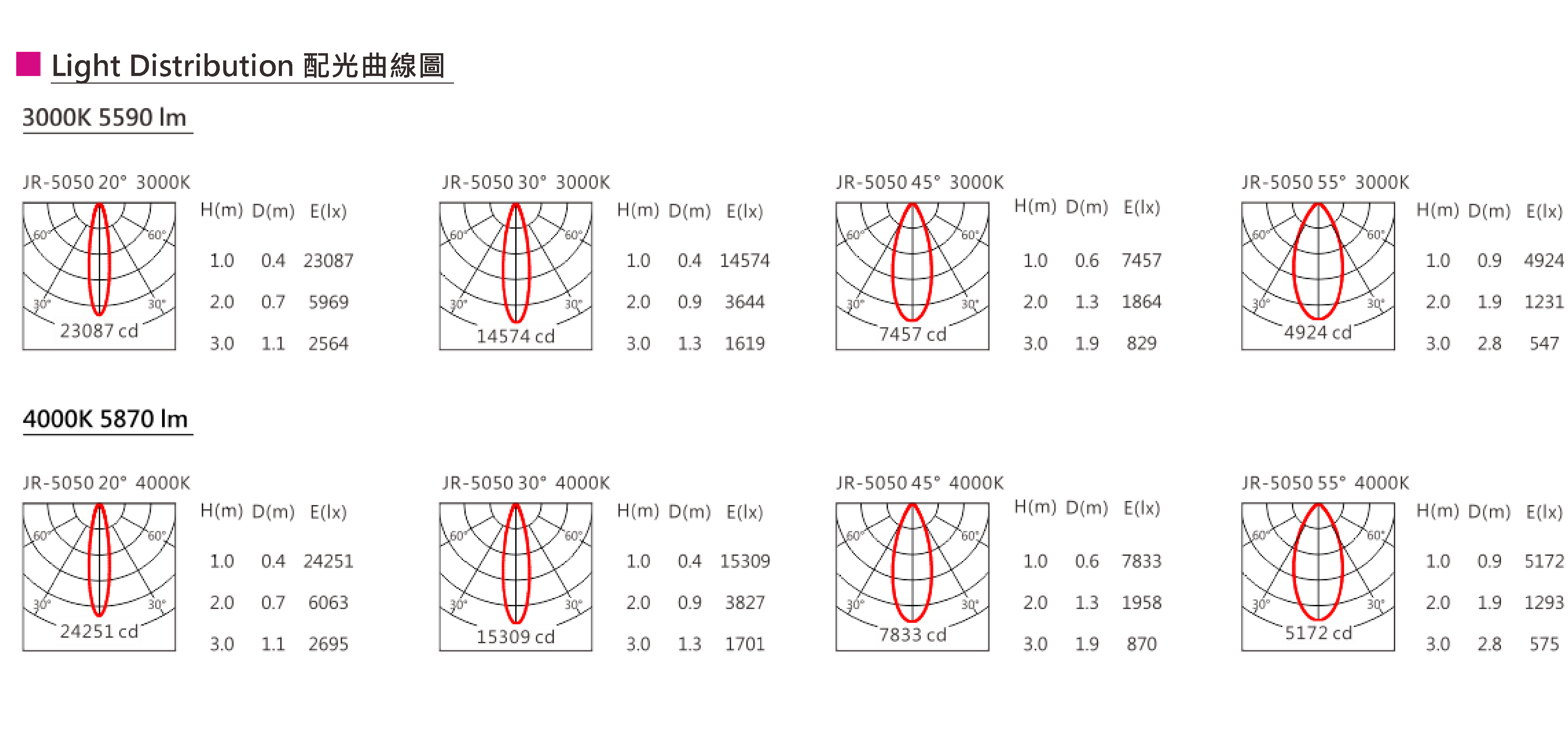 光形左右對稱,采⽤了三次配光設計,多種投射⾓度及光學配件可供選