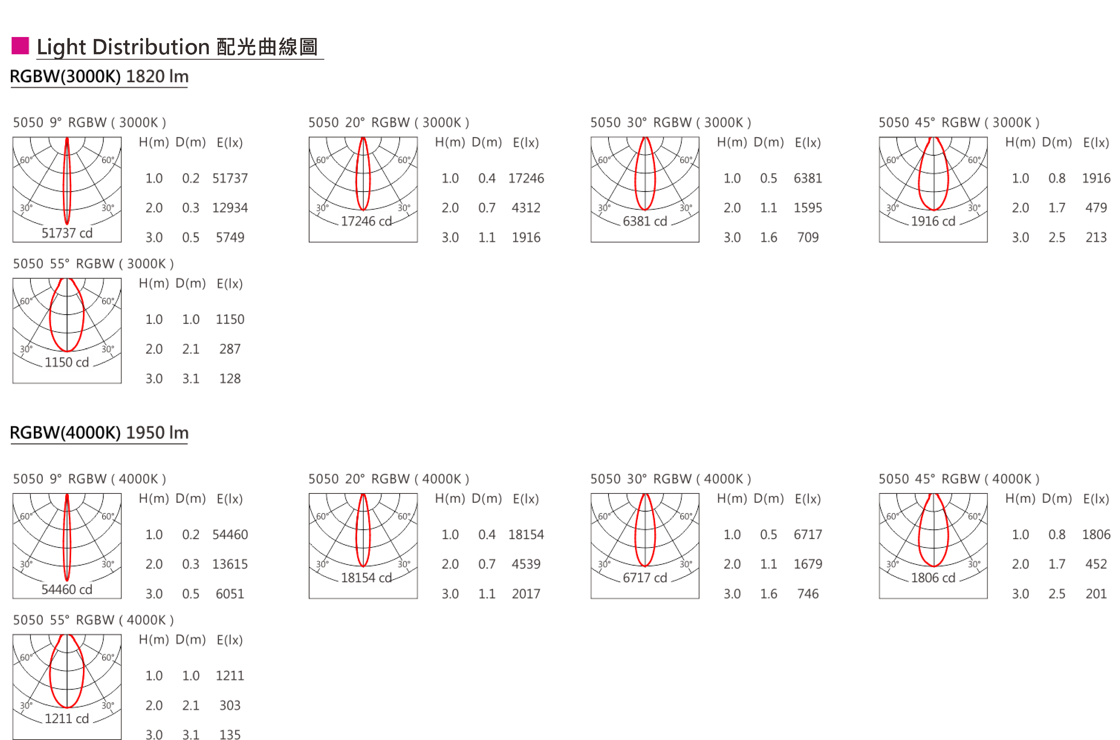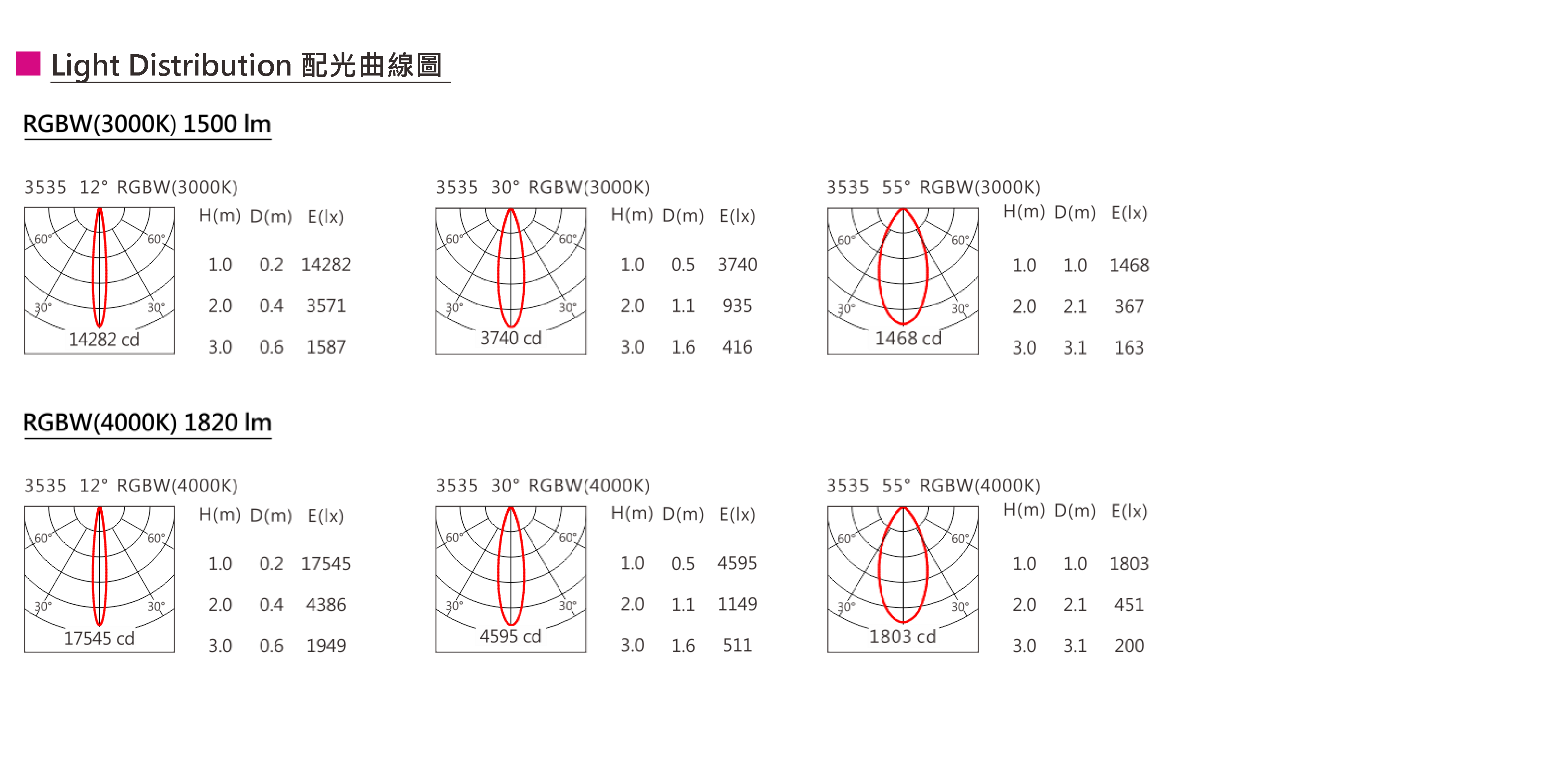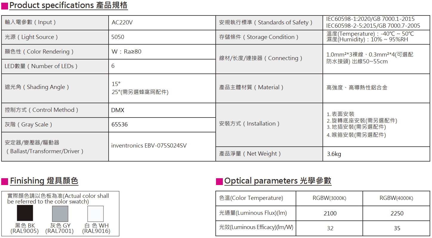 色溫(Color Temperature):RGBW(W:3000K、4000K)