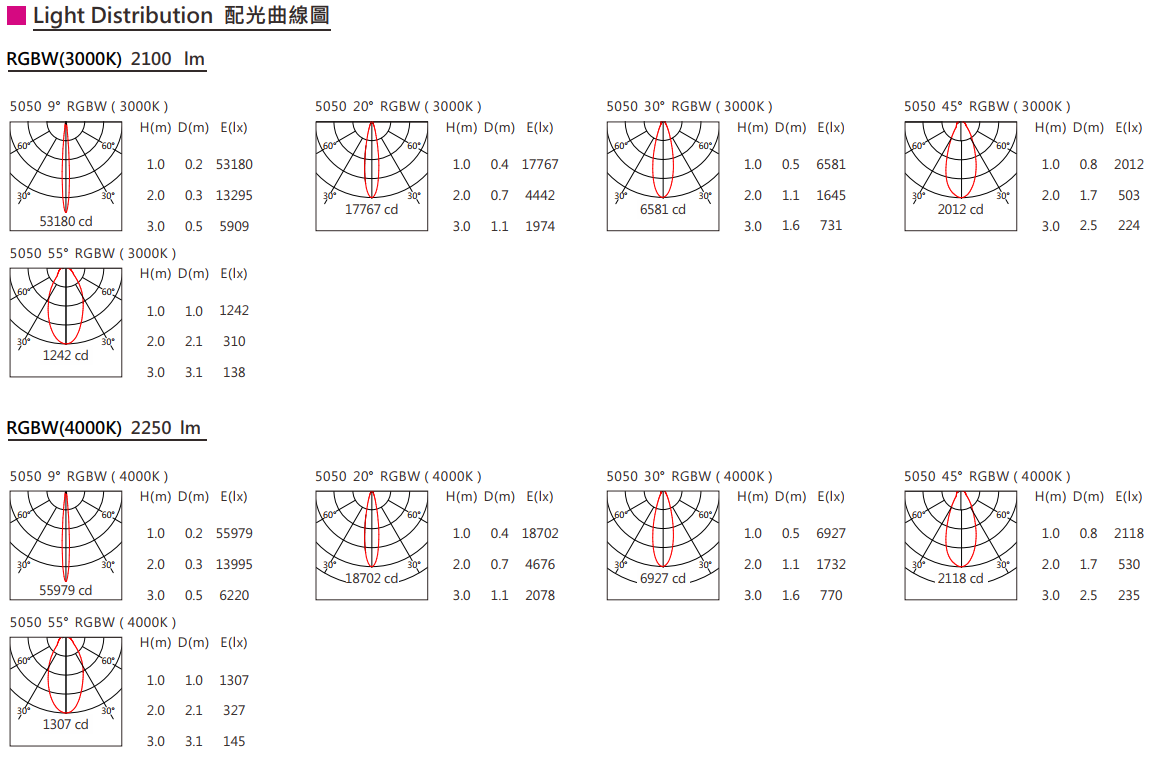 光束角(Beam Angle):9°/20°/30°/45°/55°