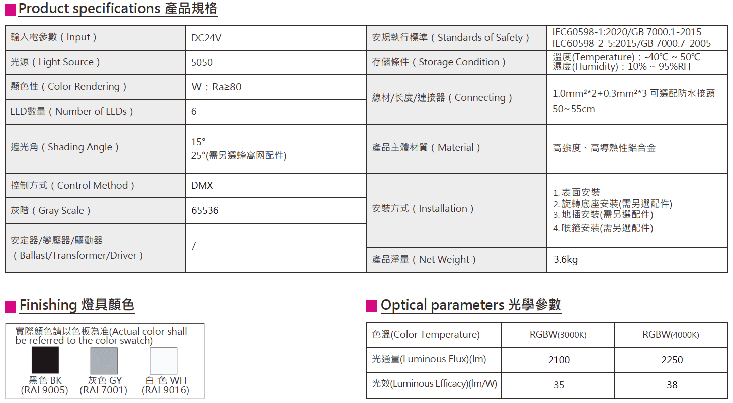 色溫(Color Temperature):RGBW(W:3000K、4000K)