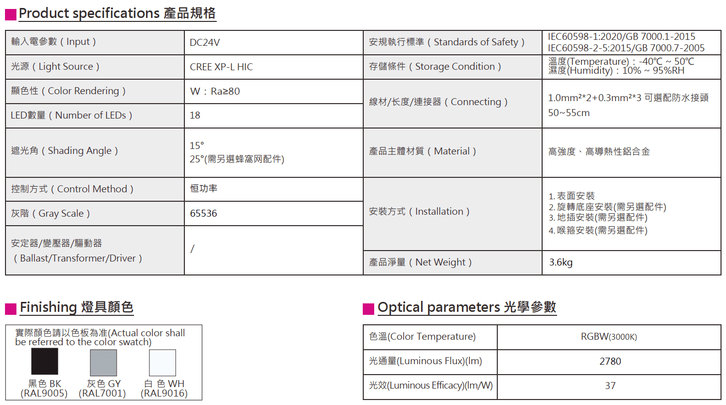 色溫(Color Temperature):RGBW(W:3000K)