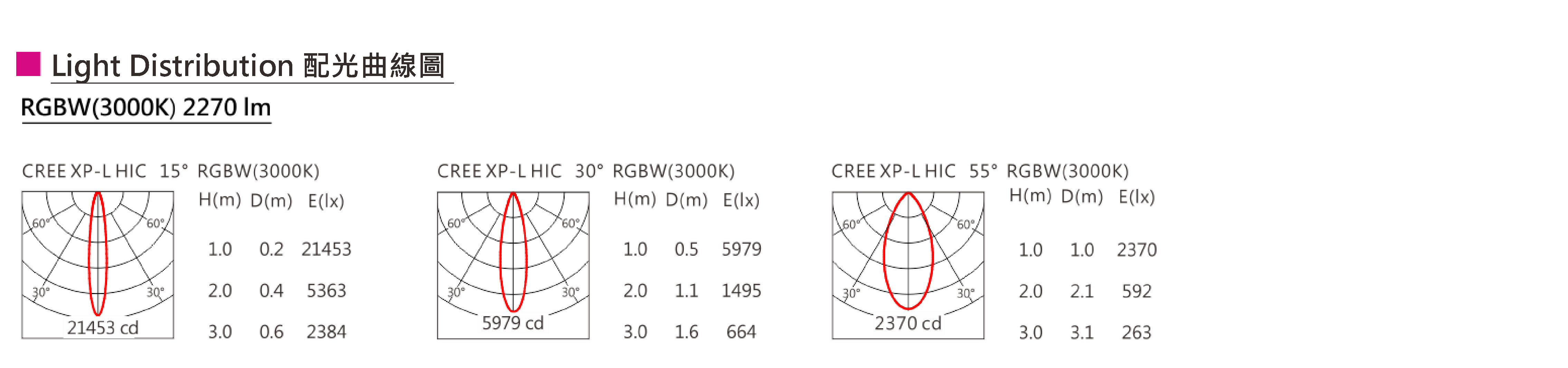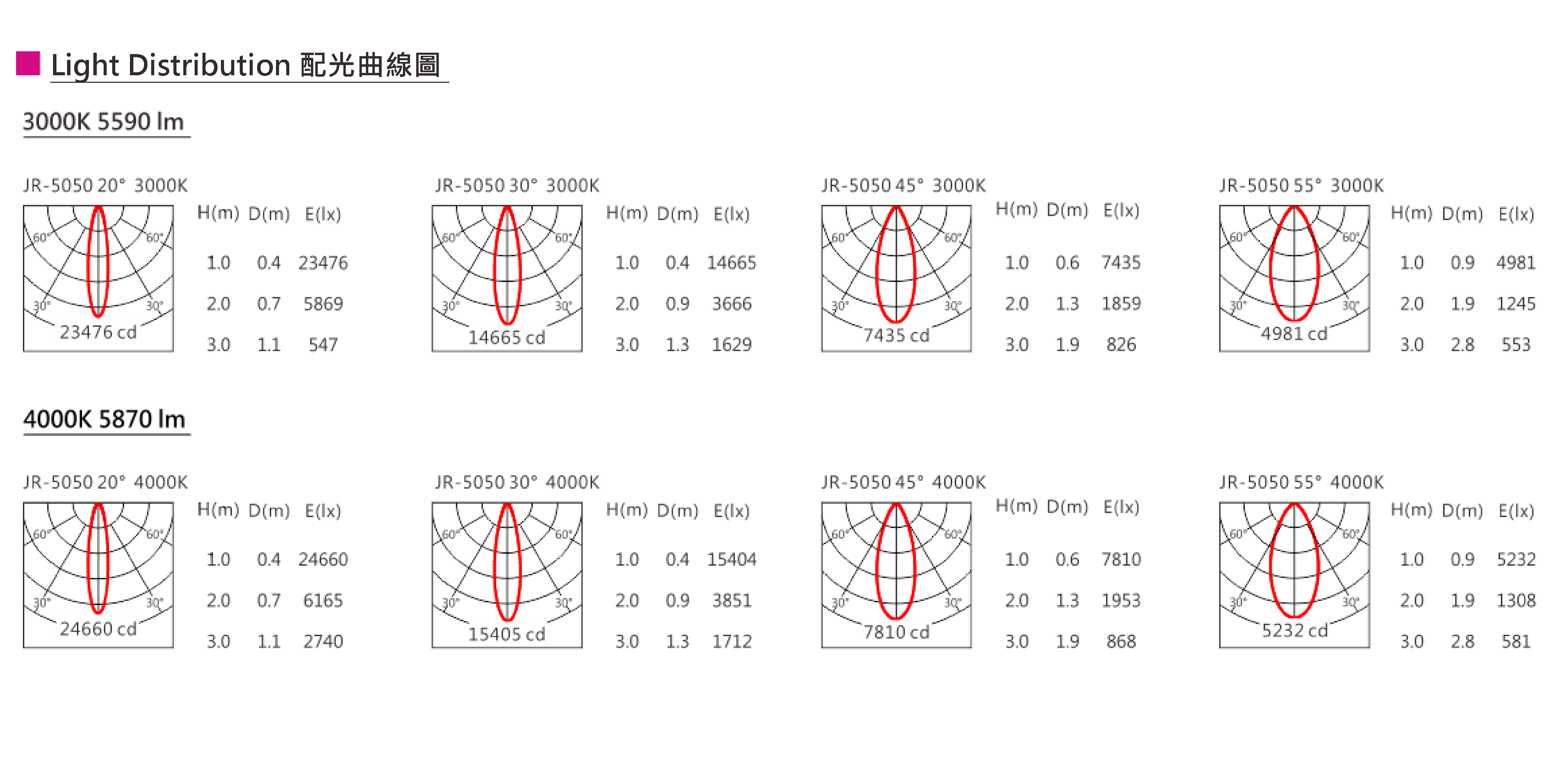 光形左右對稱,采⽤了三次配光設計,多種投射⾓度及光學配件可供選