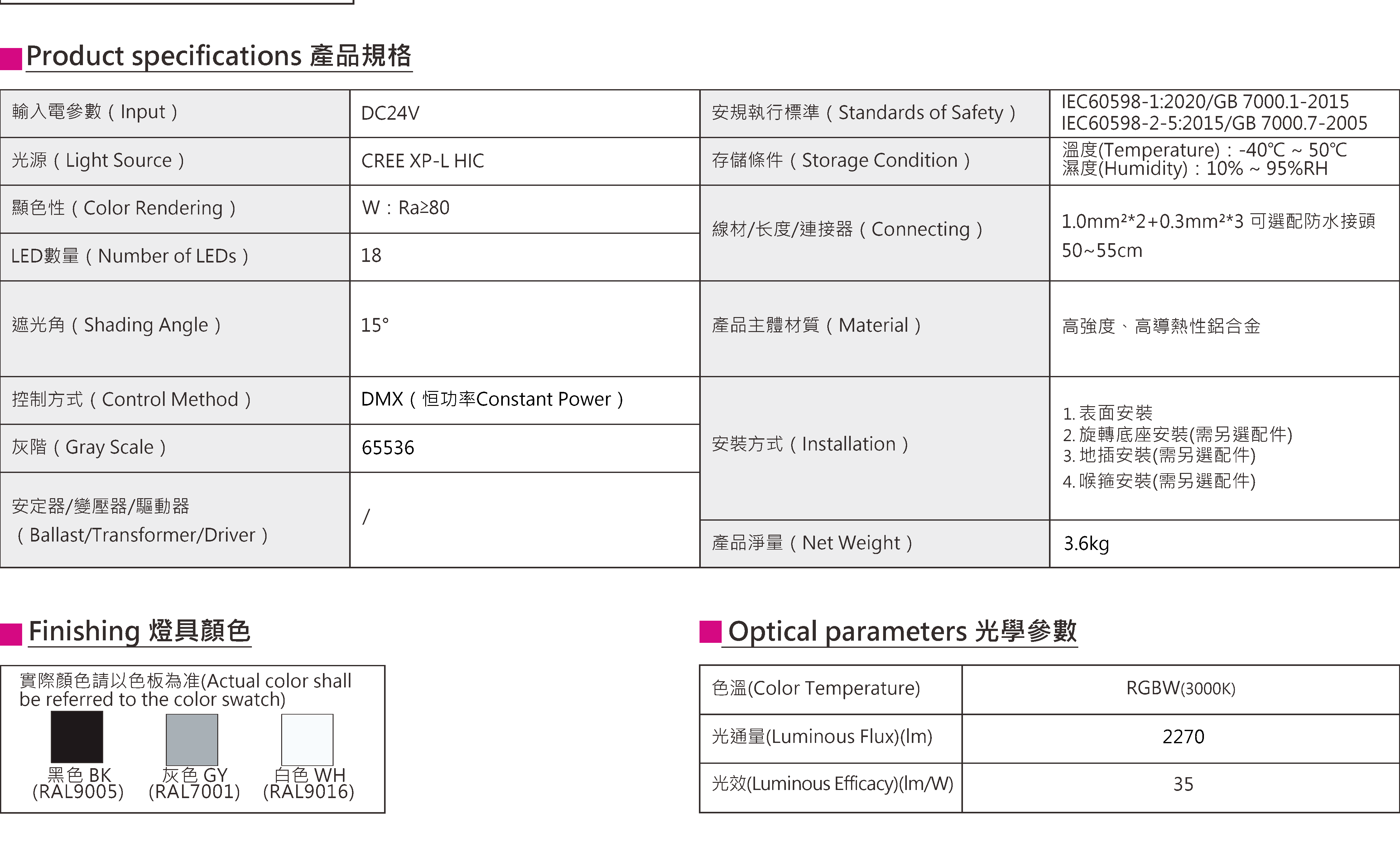 功率:65W 電壓: DC24V 控制方式:DMX 光色:RGBW 燈數:18 光束角:15°/30°/55°