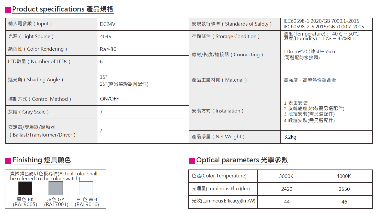 燈體采⽤⾼強度、⾼導熱性鋁合⾦材質,⾼透光鋼化光學玻璃,⼆次塗層防腐⽀架(電鍍+噴塗)
