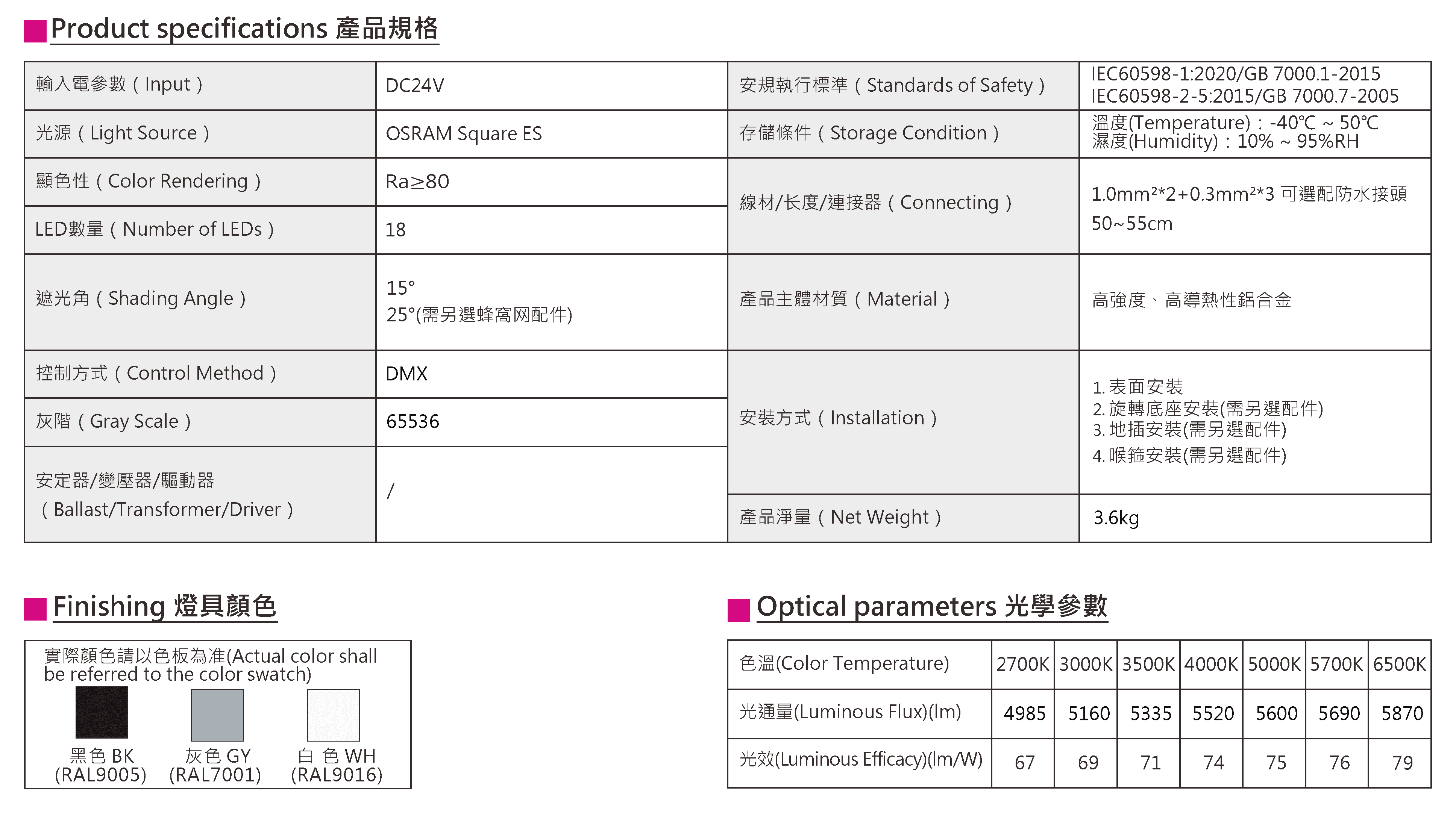 色溫(Color Temperature):2700K、3000K、3500K、4000K、5000K、5700K、6500K