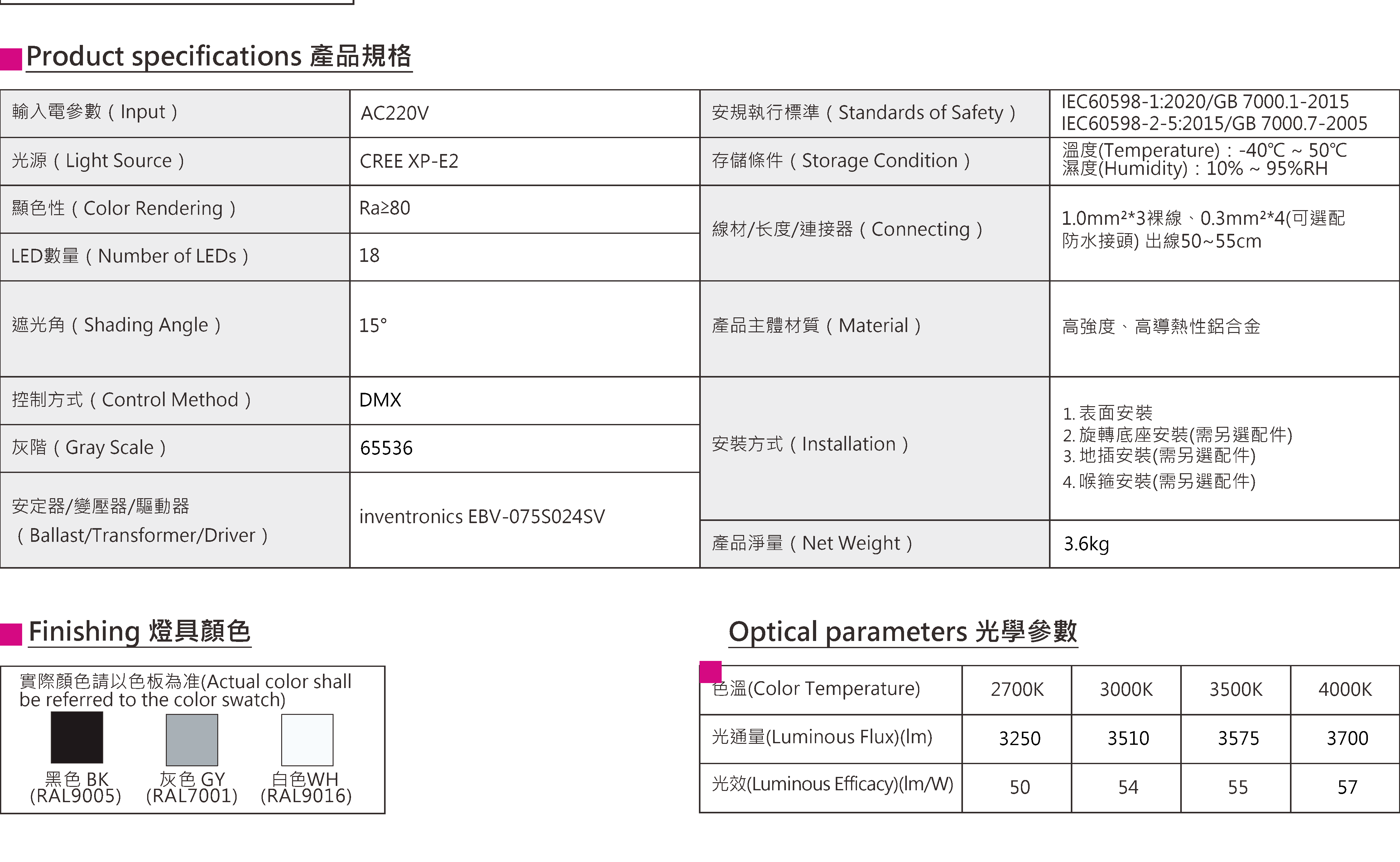 燈體采⽤⾼強度、⾼導熱性鋁合⾦材質,⾼透光鋼化光學玻璃,⼆次塗層防腐⽀架(電鍍+噴塗)