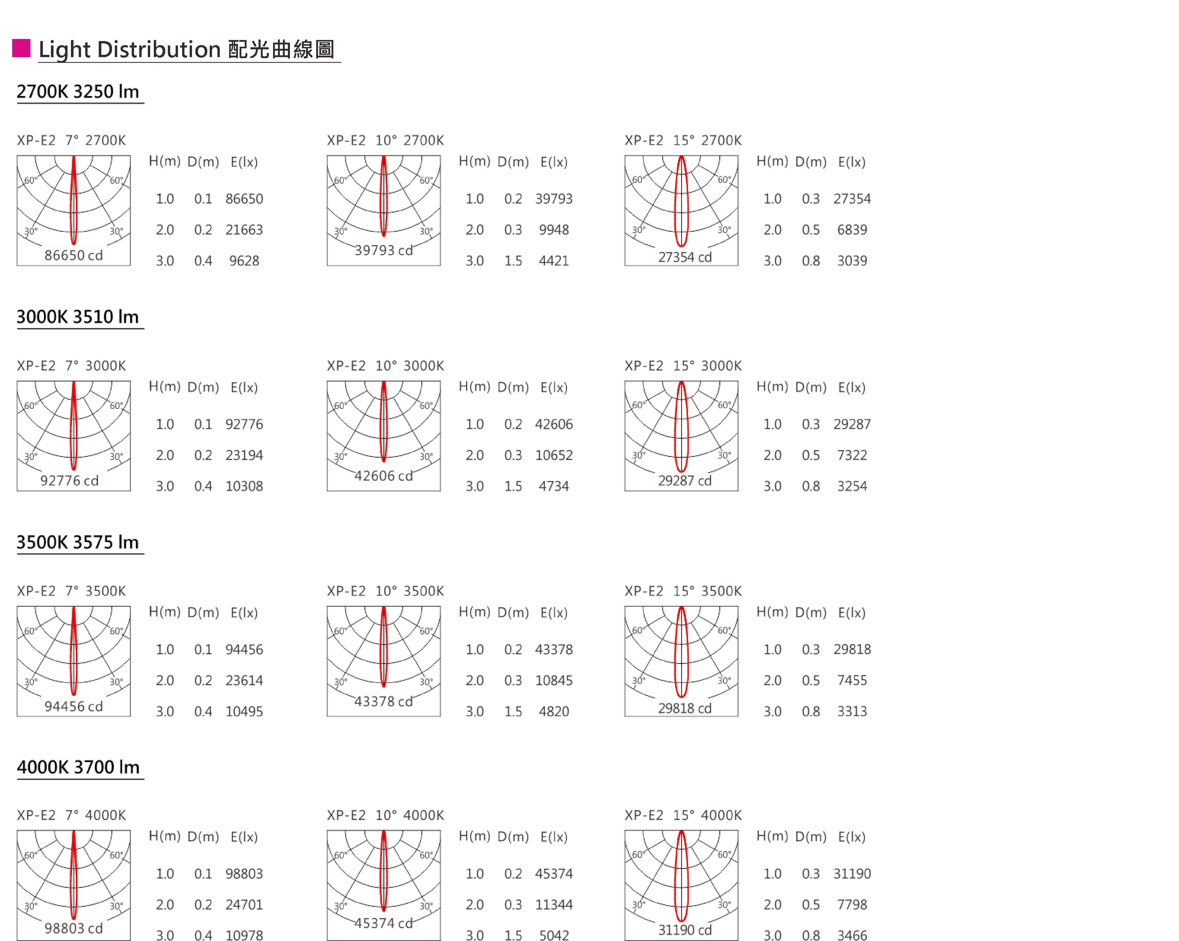 光形左右對稱,采⽤了三次配光設計,多種投射⾓度及光學配件可供選