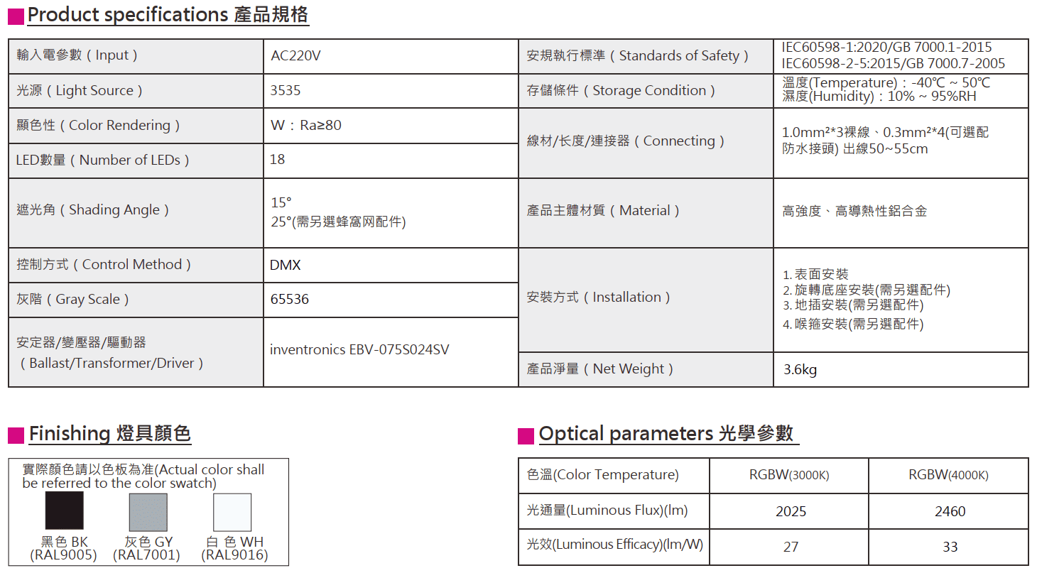 色溫(Color Temperature):RGBW(3000K、4000K)