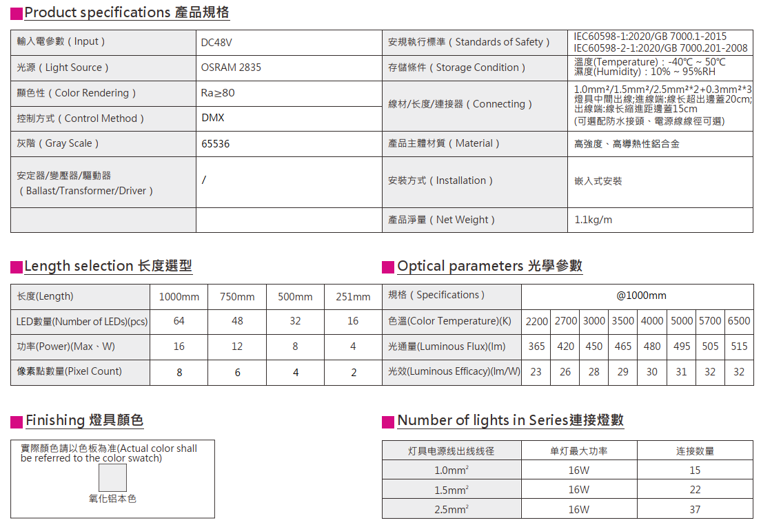 • 48V輸入電壓,允許更多燈具連續拼接,可降低安裝難度,節約施工成本