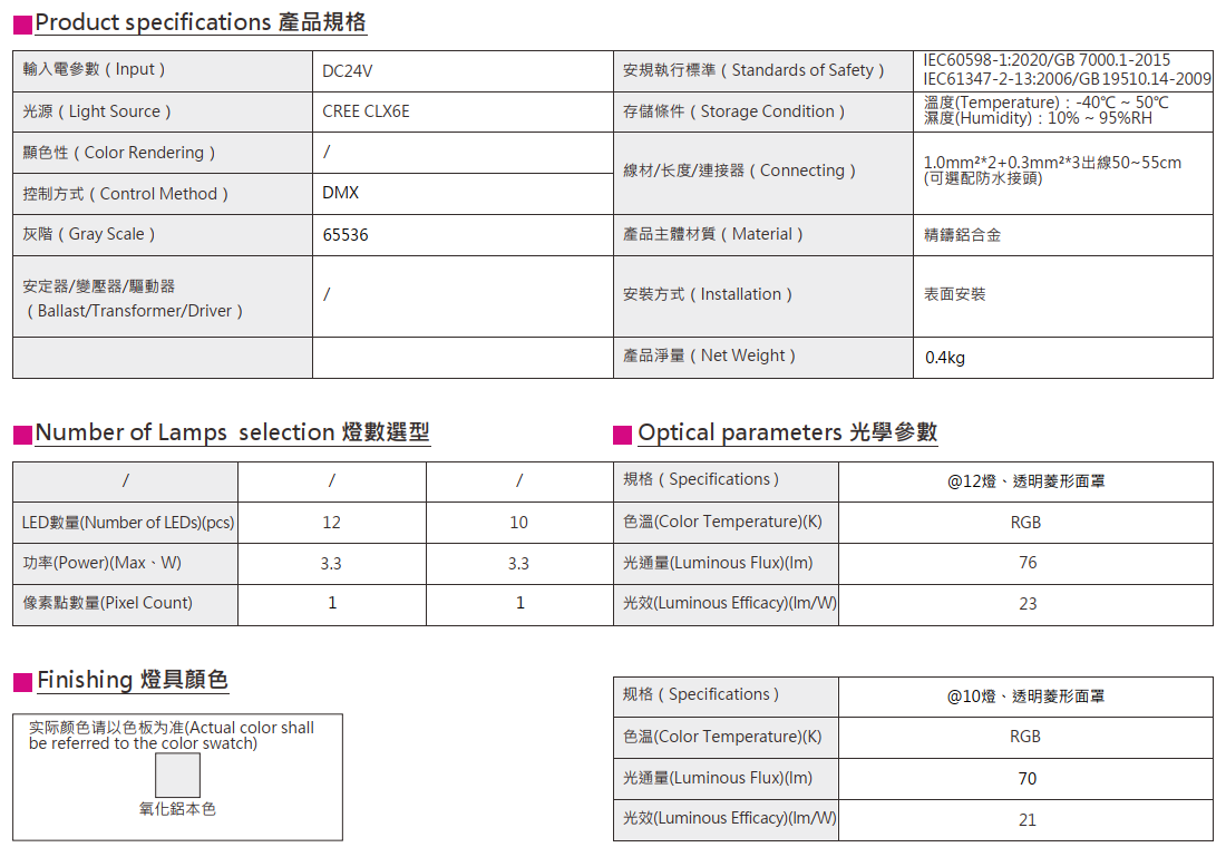 功率:3.3W 光束角: 120° IP: 66 色溫: RGB 控制方式:DMX
