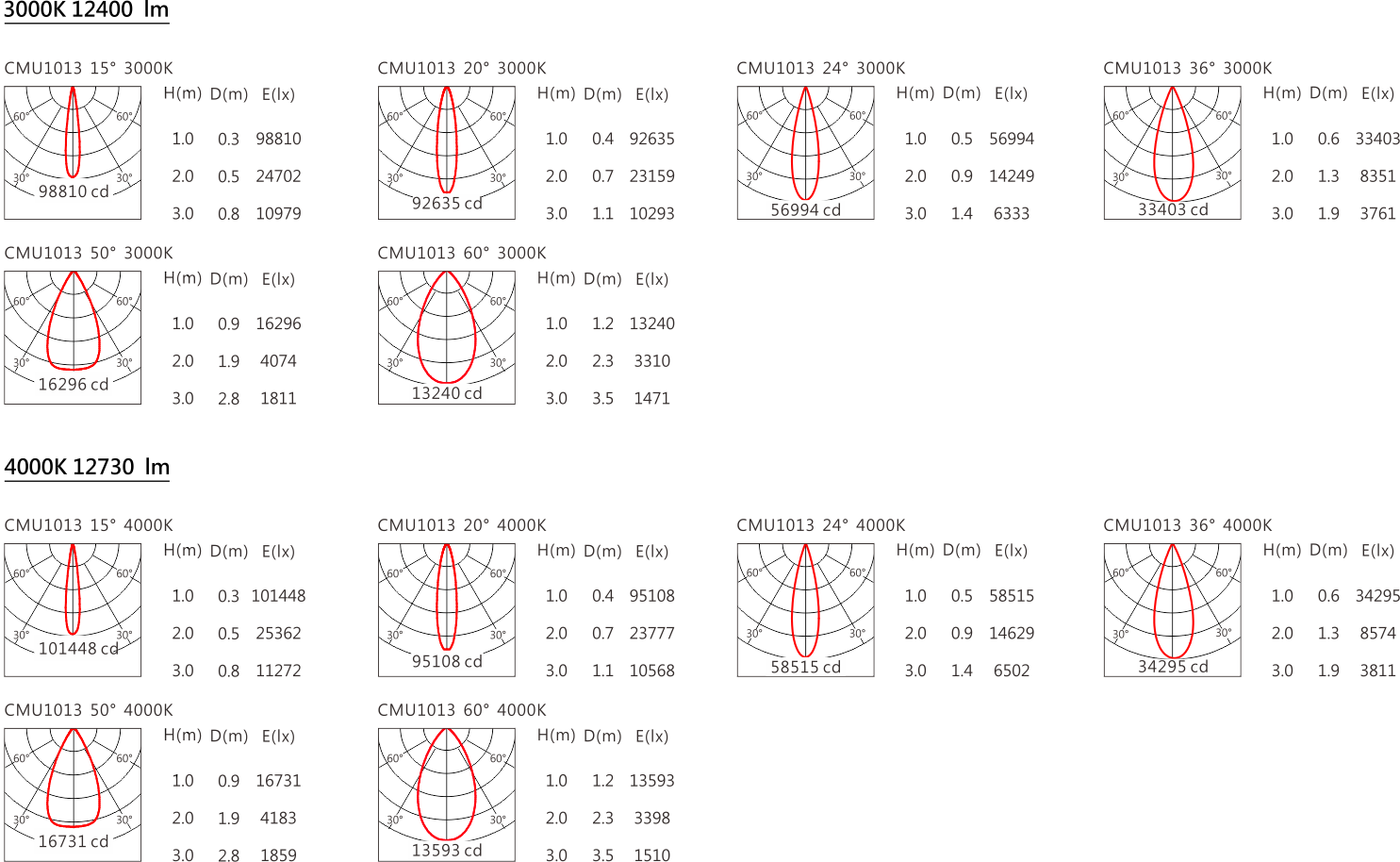 光束角(Beam Angle):15°、20°、24°、36°、50°、60°