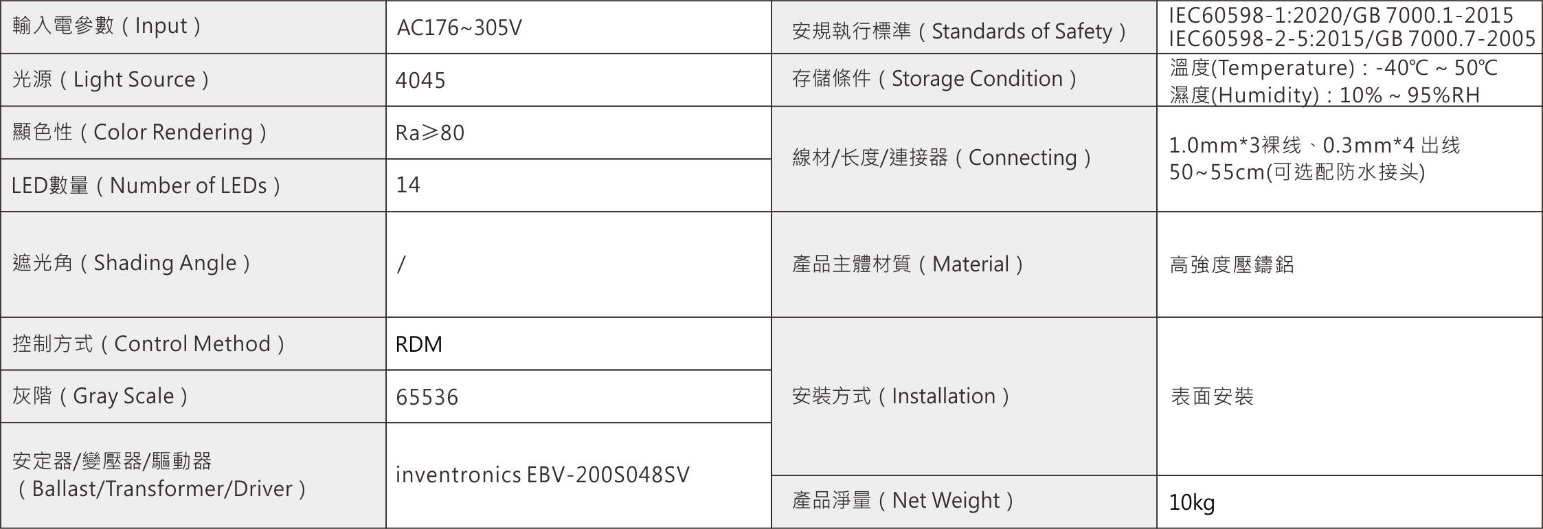 功率: 150W 電壓: AC176V~305V 光束角:3°、10°、15°、40° IP:66 光色:W 燈數:14